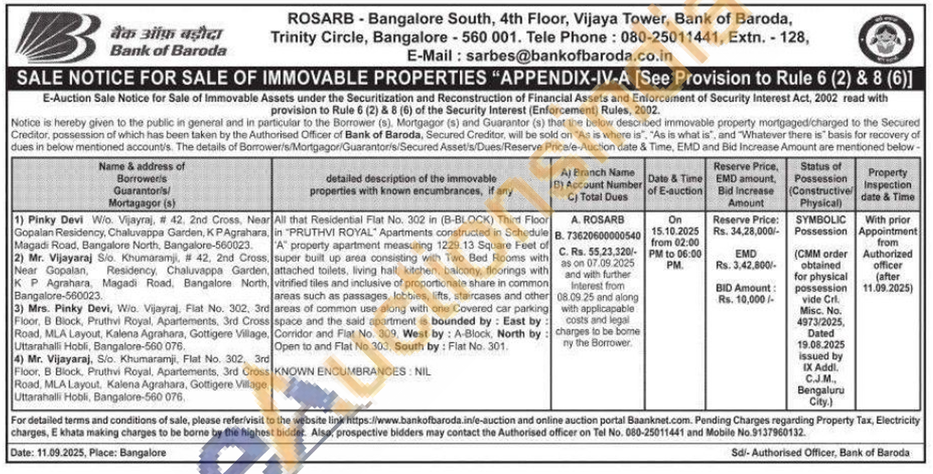 All that Residential Flat No. 302 in (B-BLOCK) Third Floor in "PRUTHVI ROYAL Apartments constructed in Schedule "A" property apartment measuring 1229.13 Square Feet of super built up area consisting with Two Bed Rooms with attached toilets, living hall, kitchen, balcony, floorings with vitrified tiles and inclusive of proportionate share in common areas such as passages, Iobbies, lifts, staircases and other areas of common use along with one Covered car parking space and the said apartment is bounded by: East by Corridor and Flat No. 309. West by: A-Block, North by Open to and Flat No 303, South by: Flat No. 301. KNOWN ENCUMBRANCES: NIL