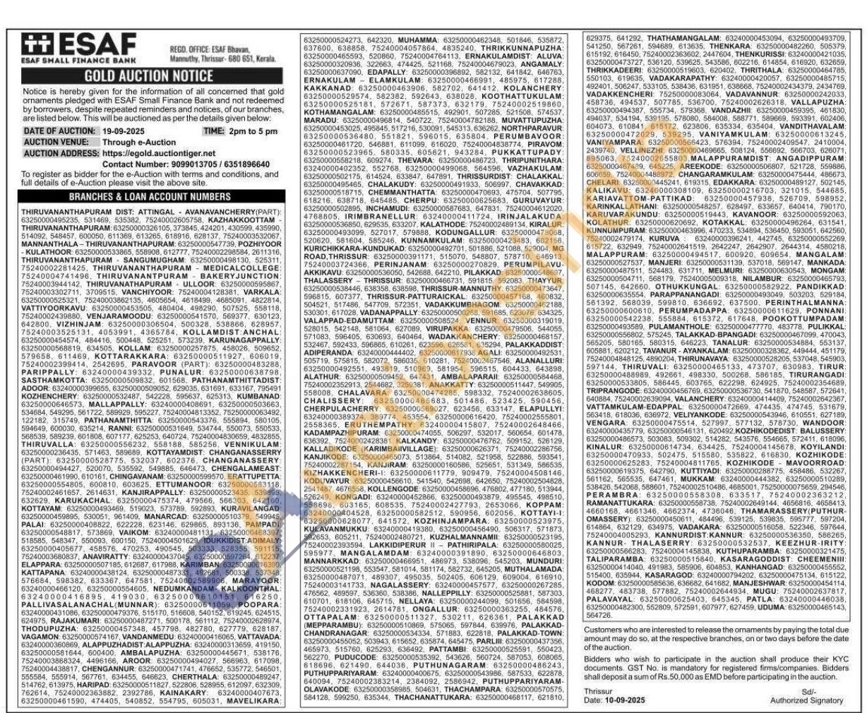 ESAF SMALL FINANCE BANK Gold Auctions Auction in Thrissur