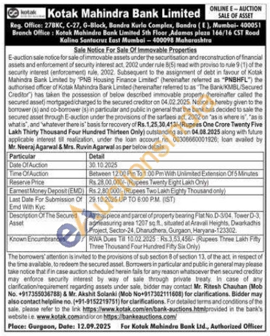 All that piece and parcel of property bearing Flat No.D-3/04, Tower D-3, admeasuring area 1207 sq.ft., situated at Aravali Heights, Dwarkadhis Project, Sector-24, Dharudhera, Gurgaon, Haryana-123302