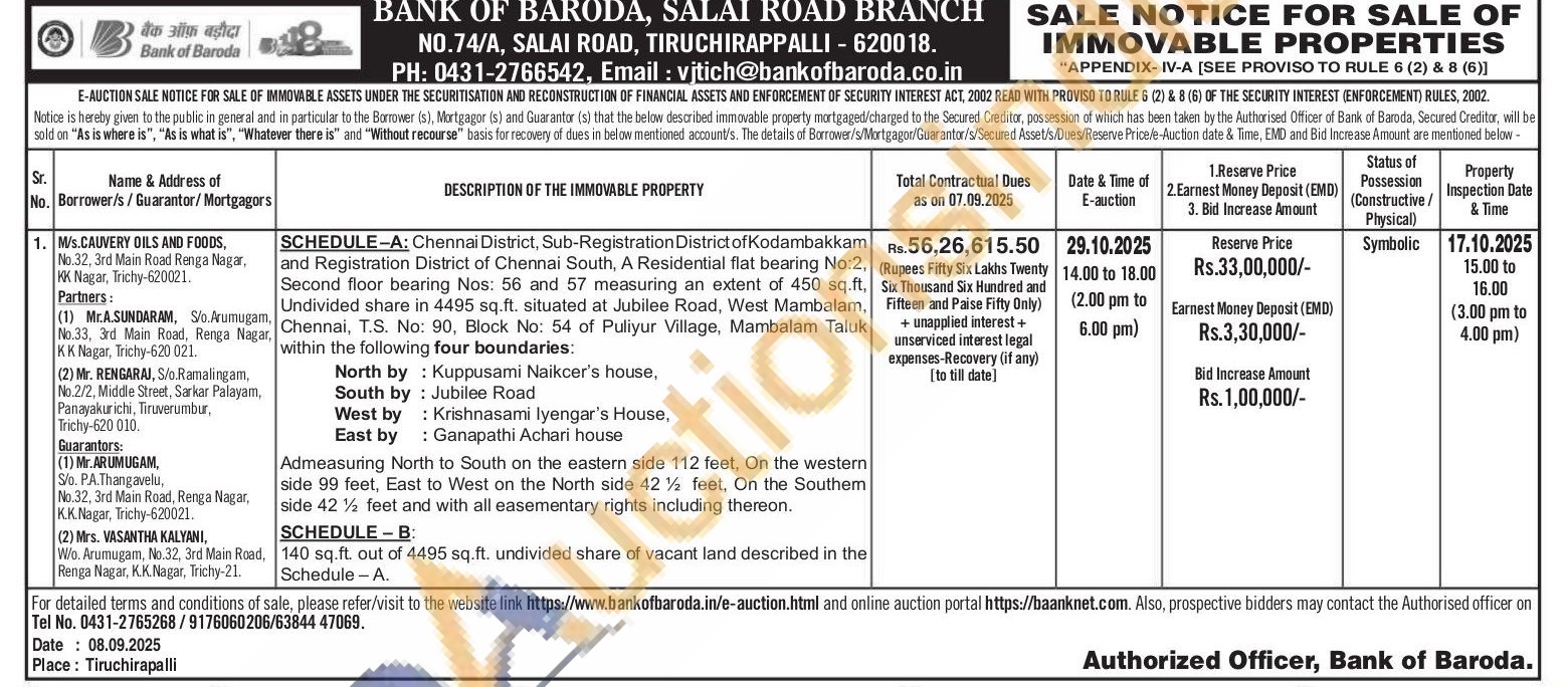 SCHEDULE-A: Chennai District, Sub-Registration District of Kodambakkam and Registration District of Chennai South, A Residential flat bearing No:2, Second floor bearing Nos: 56 and 57 measuring an extent of 450 sq.ft. Undivided share in 4495 sq.ft. situated at Jubilee Road, West Mambalam, Chennai, T.S. No: 90, Block No: 54 of Puliyur Village, Mambalam Taluk