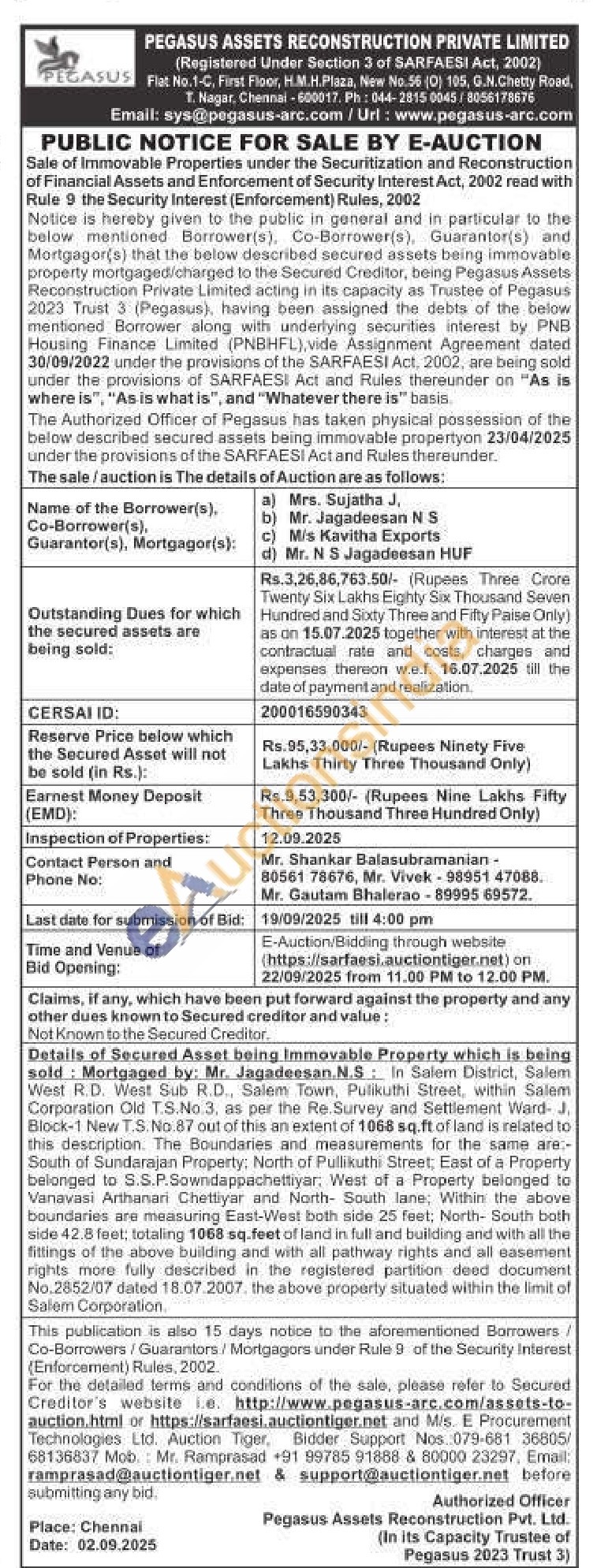 Salem District, Salem West R.D. West Sub R.D., Salem Town, Pulikuthi Street, within Salem Corporation Old T.S.No.3, as per the Re. Survey and Settlement Ward- J Block-1 New T.S. No 87 out of this an extent of 1068 sq.ft of land is related to this description. The Boundaries and measurements for the same are:-South of Sundarajan Property; North of Pullikuthi Street, East of a Property belonged to S.S.P.Sowndappachettiyar, West of a Property belonged to Vanavasi Arthanari Chettiyar and North South lane, Within the above boundaries are measuring East-West both side 25 feet, North-South both side 42.8 feet; totaling 1068 sq.feet of land in full and building and with all the fittings of the above building and with all pathway rights and all easement rights more fully described in the registered partition deed document No.2852/07 dated 18.07.2007, the above property situated within the limit of Salem Corporation.