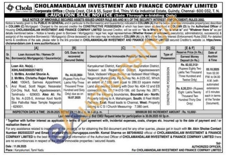 Contact Mr. Akin Sholse Contact Number 8925502237 and Email: akinsa@chola.murugappa.com/Mr. Komal Sharma on 8870464652