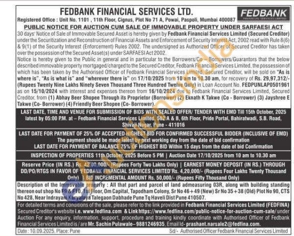 All that part and parcel of land admeasuring 03R, along with building standing thereon out shop No F9 & F10, 1st Floor, Om Capital, Tapodham Colony, Sr No 46+49 (New) Sr No 35+38 (Old) Plot No 90, CTS No 428, Near Indrayani Karyalaya Talegaon Dabhade Pune To Haveli Dist Pune 410507.