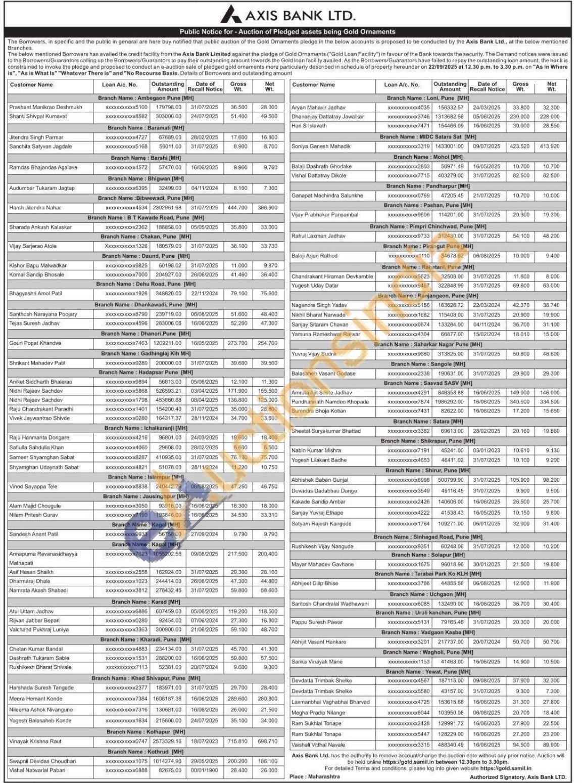 Axis Bank Gold Auctions Auction in Pune