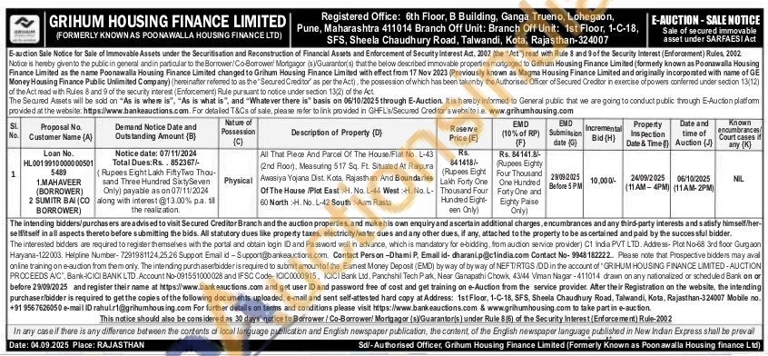 All That Piece And Parcel Of The House/Flat No. L-43 (2nd Roor), Measuring 517 Sq. Ft. Situated At Raipura Awasiya Yojana Dist. Kota. Rajasthan. And Boundaries Of The House /Plot East:H. No. L-44 West: H. No. L-60 Narth: H. No. L-42 South-Aam Rasta