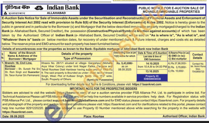 Khasra No. 28/1/1 situated at village Ganeshpur (Mohalla Arya Vihar Colony) under limit Nagar Palika, Pargana and Sio Tehsil Roorkee Distt Haridwar having super area of 1003 Sq : ft. The said property is Bounded as under-East: land of Anwar Singh, West: Plot of Kulbeer Singh, North: Way 15'0" wide, South: Property of Others.