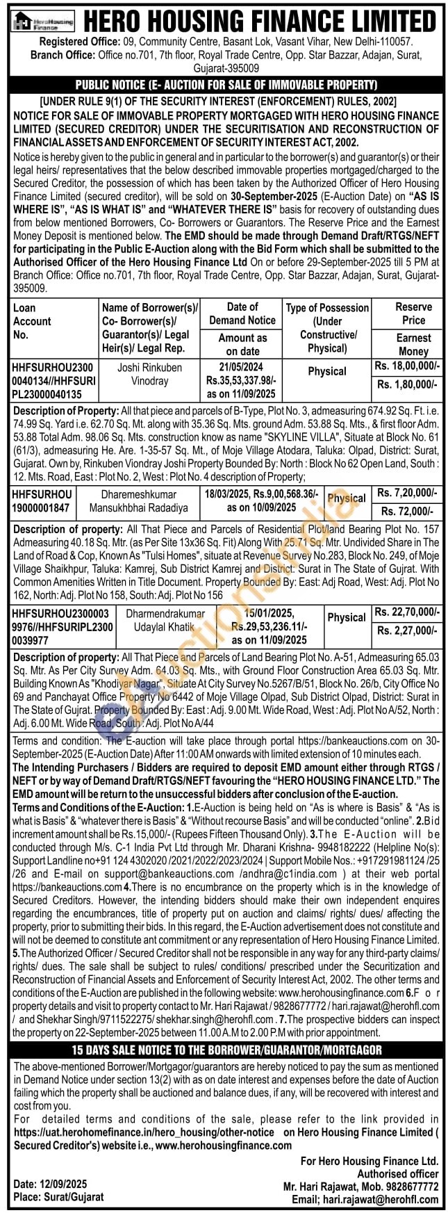 Contact Authorised officer Mr. Hari Rajawat, Mob. 9828677772