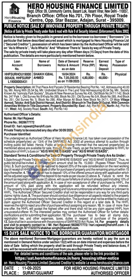 Contact Authorised officer Mr. Hari Rajawat, Mob. 9828677772