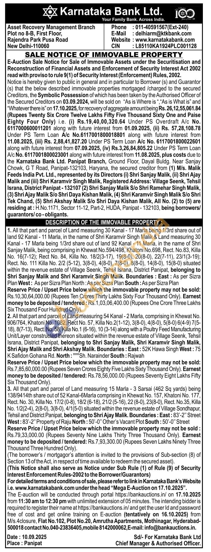 3. All that part and parcel of Land measuring 15 Marla - 3 Sarsai (462 Sq yards) being 138/9414th share out of 52 Kanal-6Marla comprising in Khewat No. 157, Khatoni No. 177, Rect. No. 30, Killa No. 17/2 (0-8), 18/2 (6-18), 21/2 (5-16), 22 (8-0), 23(8-0), Rect. No.35, Killa No. 1/2(2-4), 2(8-0), 3(8-0), 4/1(5-0) situated within the revenue estate of Village Sondhapur, Tehsil and District Panipat, belonging to Shri Ajay Malik. Boundaries: East: 83'-2" Street West: 83-2" Property of Raju North: 50'-0" Other's Vacant Plot South: 50'-0" Street