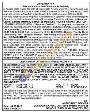 RESIDENTIAL FLAT NO. 2 ON 1ST FLOOR OF DHARMBHAKTI SANKUL, WITH BUILT-UP AREA OF 549-69 SQ. FEET THAT IS 51-07 SQ. MTS. AND BEING ON LAND ADMEASURING 413-78 SQ. MTS. OF PLOT NOS. 20 AND 21, F. P. PLOT NOS. 218, T. P. NOS. 5 OF RAJKOT REVENUE SURVEY NOS. 338 (P) CITY SURVERY WARD NOS. 8/1, CITY SURVEY NOS. 1571/4/20 AND 1571/4/21, B/H GEETA MANDIR, NEAR SHYAM WADI, NEAR JALARAM CHOWK, NEAR BHAKTINAGAR CIRCLE, OFF. 80 FT. ROAD, RAJKOT-360002, GUJARAT. BOUNDED BY: NORTH FLAT NOS.F-1 EAST FLAT NOS.F-6 SOUTH ROAD WEST FLAT NOS. F-3