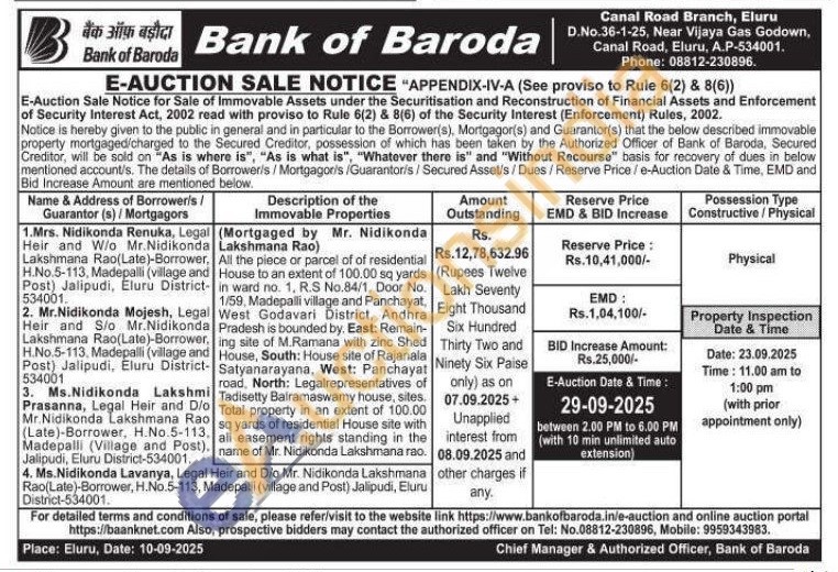 (Mortgaged by Mr. Nidikonda Lakshmana Rao) All the piece or parcel of of residential House to an extent of 100.00 sq yards in ward no. 1. R.S No.84/1, Door No. 1/59, Madepalli village and Panchayat, West Godavari District, Andhra Pradesh is bounded by. East: Remain-ing site of M.Ramana with zinc Shed House, South: House site of Rajanala Satyanarayana, West: Panchayat road, North: Legalrepresentatives of Tadisetty Bairamaswamy house, sites. Total property in an extent of 100.00 sq yards of residential House site with all easement rights standing in the name of Mr. Nidikonda Lakshmana rao
