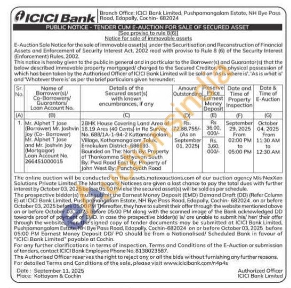 2BHK House Covering Land Area of 16.19 Ares (40 Cents) in Re Survey No. 688/1A-1-94-2 Kuttamangalam Village, Kothamangalam Taluk, Ernakulam District-686693. Bounded on The North By: Property of Thankamma Sathyavan South By: Pwd Rood East By: Property of John West By: Panchayath Rood