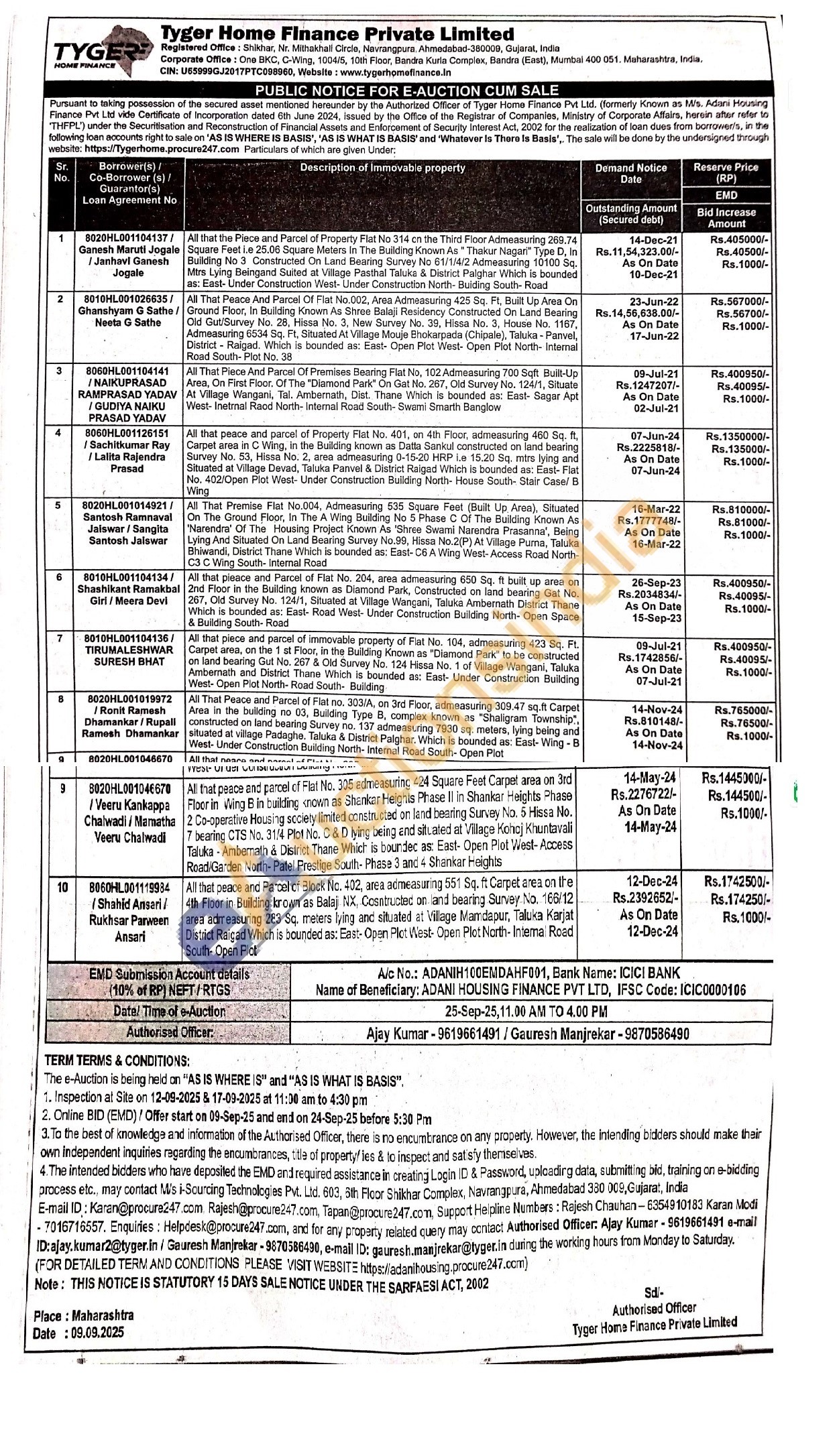All that peace and parcel of Flat No. 305 admeasuring 424 Square Feet Carpet area on 3rd Floor in Wing B in building <nown as Shankar Heights Phase II in Shankar Heights Phase 2 Co-operative Housing society limited constructed on land bearing Survey No. 5 Hissa No. 7 bearing CTS No. 31/4 Plot No. C & D lying being and situated at Village Kohoj Khuntavali Taluka - Ambernath & District Thane Which is boundec as: East- Open Plot West-Access Road/Garden North-Patel Prestige South- Phase 3 and 4 Shankar Heights