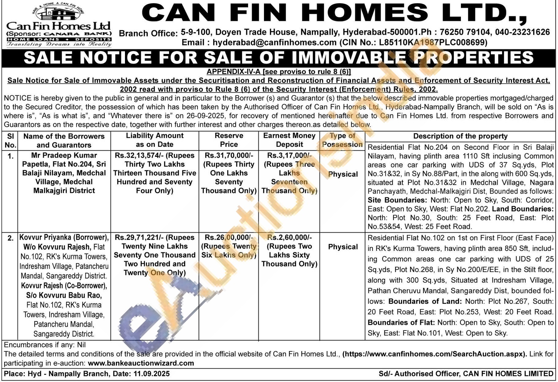 Residential Flat No. 102 on 1st on First Floor (East Face) in RK's Kurma Towers, having plinth area 850 Sft, includ-ing Common areas one car parking with UDS of 25 Sq.yds, Plot No.268, in Sy No.200/E/EE, in the Stilt floor, along with 300 Sq.yds, Situated at Indresham Village, Pathan Cheruvu Mandal, Sangareddy Dist, bounded fol-lows: Boundaries of Land: North: Plot No.267, South: 20 Feet Road, East: Plot No.253, West: 20 Feet Road. Boundaries of Flat: North: Open to Sky, South: Open to Sky, East: Flat No. 101, West: Open to Sky.
