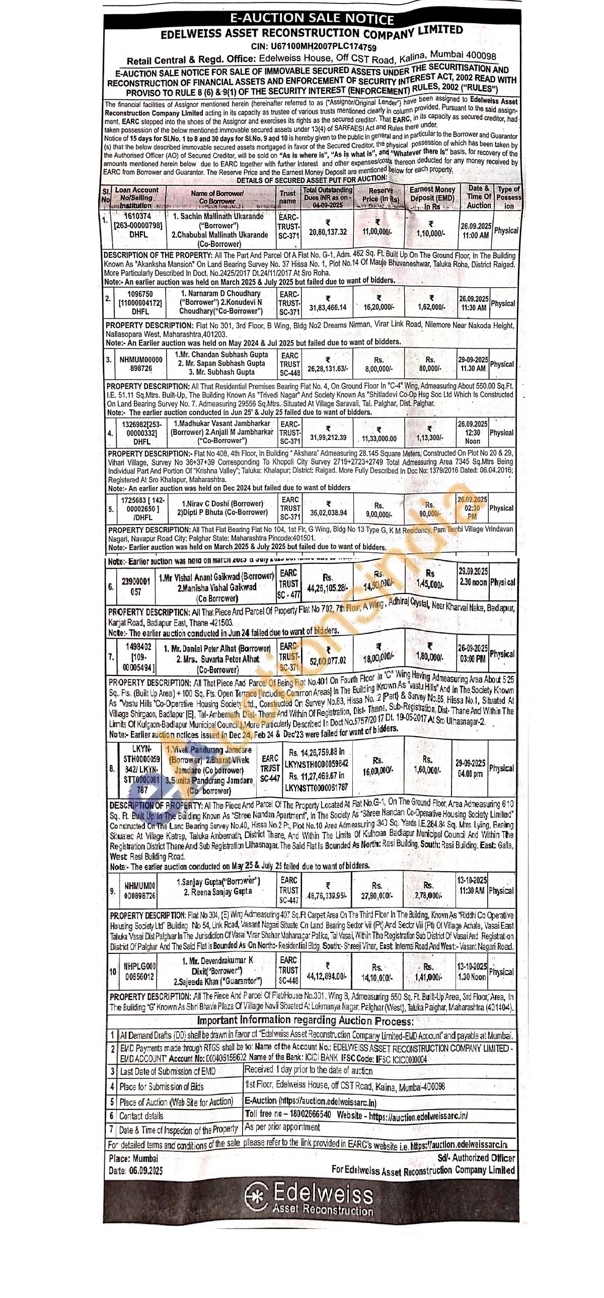 PROPERTY DESCRIPTION: All That Flat Bearing Flat No 104, 1st Flr, G Wing, Bldg No 13 Type G, KM Residency, Pam Tembi Village Vrindavan Nagari, Navapur Road City: Palghar State: Maharashtra Pincode:401501.