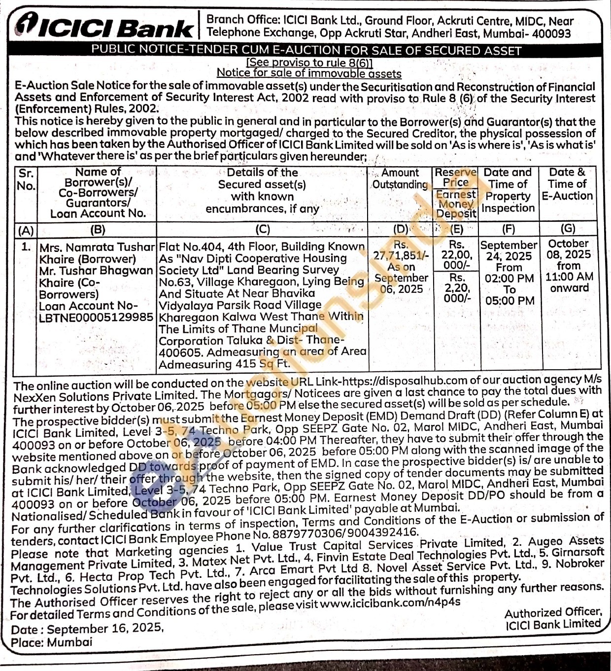 Flat No.404, 4th Floor, Building Known As "Nav Dipti Cooperative Housing Society Ltd" Land Bearing Survey No.63, Village Kharegaon, Lying Being And Situate At Near Bhavika Vidyalaya Parsik Road Village Kharegaon Kalwa West Thane Within The Limits of Thane Muncipal Corporation Taluka & Dist- Thane-400605. Admeasuring an area of Area Admeasuring 415 Sq Ft.