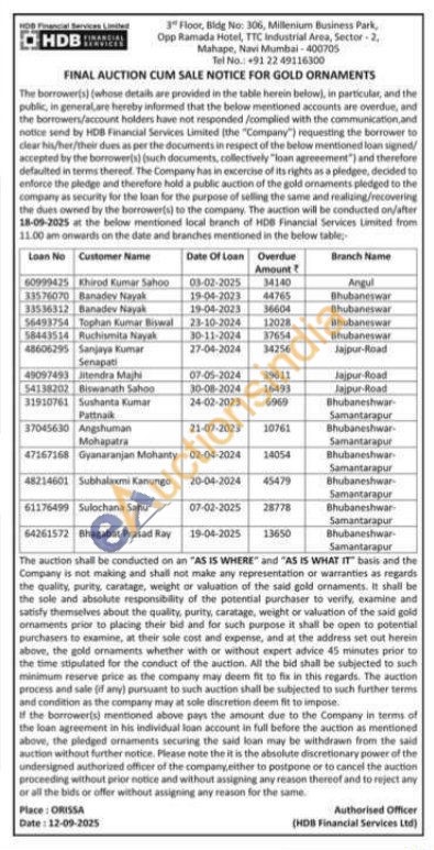 HDB Financial Services Limited Gold Auctions Auction in Bhubaneswar