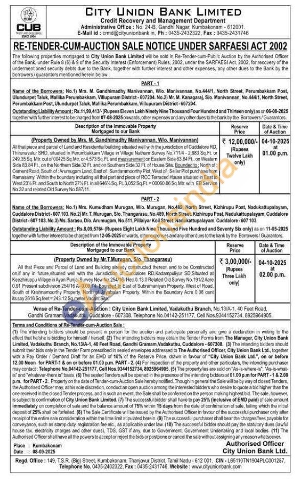 All that piece and parcel of Land and Residential building situated well with the jurisdiction of Cuddalore RD, Thirunavalur SRD, situated in Perumbakkam Village in Village Natham Survey No 711/4-2.683 Sq Ft. or 249.35 Sq. Mir out of 00425 Sq. Mtr or 4.573 Sq Ft. and measurement on Eastem Side 83.84 Ft, on Western Side 83.84 FL, on the Northem Side 32 Ft., and on Southem Side 32 Ft. of House Site. Bounded to North of: Cement Road, South of: Arumugam Land, East of. Sundaramoorthy Plot, West of: Seller Plot purchase from Ramasamy. Within the boundary including all that part and piece of RCC Terraced House situated in East to West 23% Ft. and South to North 27% Ft in all 646% Sq. Ft. 3.052 Sq.FL-00060.06 Sq.Mtr with EB Service No.32 and related Old Survey No. 587/11
