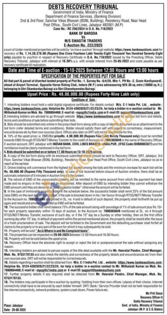 All that part & parcel of diverted landed property at Plot No.-1, Survey No.-6/4/28, Min-1, PH No.-2. Gram-Kardiyavardi, ahead of Airport Terminal, Opposite Horse Riding Club, Indore (M.P.) area admeasuring 929.36 sq.mtrs (10000 sq.ft.): belonging to Shri Shankardas Bairagi s/o Shri Ghanshyamdas Bairagi.
