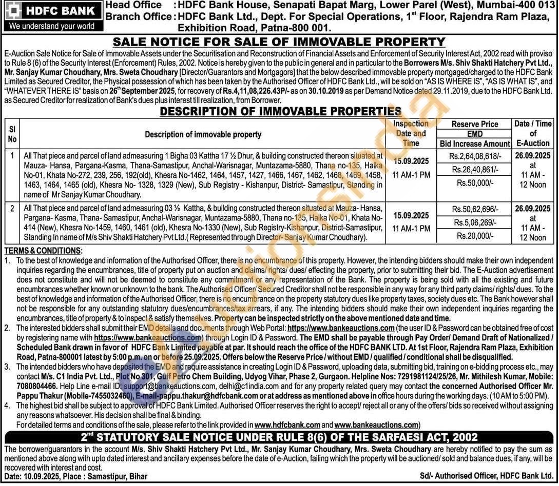 All That piece and parcel of land admeasuring 1 Bigha 03 Kattha 17% Dhur, & building constructed thereon situated at Mauza- Hansa, Pargana-Kasma, Thana-Samastipur, Anchal-Warisnagar, Muntazama-5880, Thana no-135, Halka No-01, Khata No-272, 239, 256, 192(old), Khesra No-1462, 1464, 1457, 1427, 1466, 1467, 1462, 1468, 1469, 1458, 1463, 1464, 1465 (old), Khesra No- 1328, 1329 (New), Sub Registry - Kishanpur, District- Samastipur, Standing in name of Mr Sanjay Kumar Choudhary