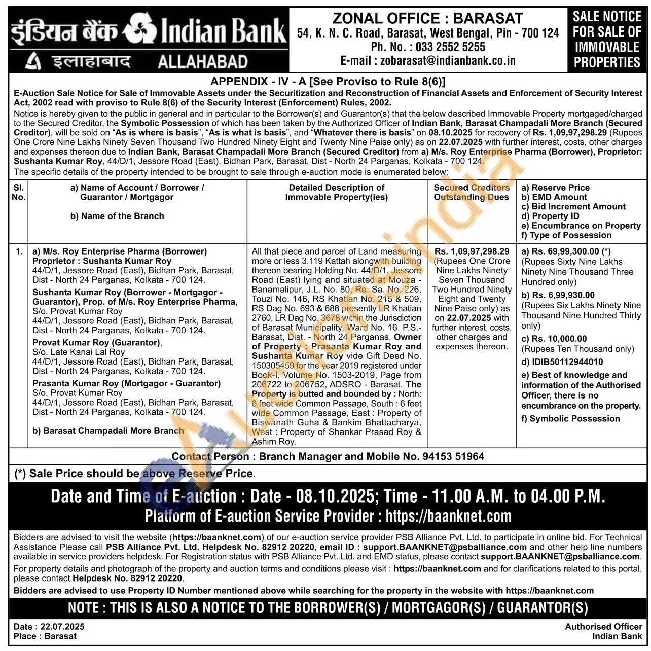 All that piece and parcel of Land measuring more or less 3.119 Kattah alongwith building thereon bearing Holding No. 44/D/1, Jessore Road (East) lying and situated at Mouza Banamalipur, J.L. No. 80, Re. Sa. No. 226, Touzi No. 146, RS Khatian No. 215 & 509, RS Dag No. 693 & 688 presently LR Khatian 2760, LR Dag No. 3678 within the Jurisdiction of Barasat Municipality, Ward No. 16. P.S.-Barasat, Dist. North 24 Parganas. Owner of Property: Prasanta Kumar Roy and Sushanta Kumar Roy vide Gift Deed No. 150305459 for the year 2019 registered under Book-I, Volume No. 1503-2019, Page from 206722 to 206752, ADSRO - Barasat. The Property is butted and bounded by: North: 6 feet wide Common Passage, South: 6 feet wide Common Passage, East: Property of Biswanath Guha & Bankim Bhattacharya, West: Property of Shankar Prasad Roy & Ashim Roy.