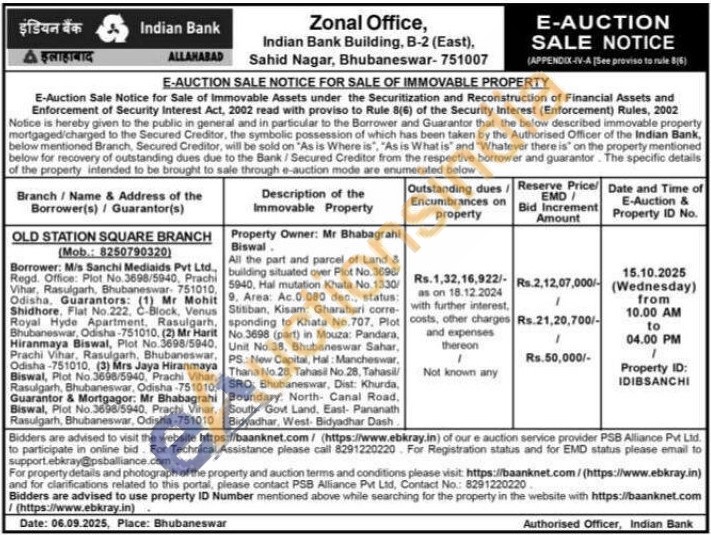 All the part and parcel of Land & building situated over Plot No. 3698/5940. Hal mutation Khata No. 1330 9. Area: Ac. 0.080 dec., status: Stitiban, Kisam: Gharabari corre sponding to Khata No.707. Plot No. 3698 (part) in Mouza: Pandara, Unit No.38, Bhubaneswar Sahar, PS: New Capital, Hal: Mancheswar, Thana No. 28, Tahasil No. 28, Tahasil SRO: Bhubaneswar, Dist: Khurda, Boundary: North- Canal Road, South- Govt Land, East- Pananath Bidyadhar, West Bidyadhar Dash