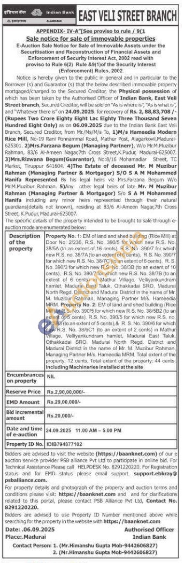 Property No. 1: EM of land and shed building (Rice Mill) at Door No. 2/230, R.S. No. 390/5 for which new R.S. No. 36/54 (to an extent of 16 cents), R.S. No. 390/7 for which new R.S. no. 38/7A (to an extent of 6 cents), R.S. No. 390/7 for which new R.S. No. 38/70 (to an extent of 6 cents), R. S. No. 390/3 for which new RS. No. 38/38 (to an extent of 10 cents), RS. No: 390/7 for which new R.S. No. 38/7B (to an estent of 6 cents) in Mathur Village, Vellyankundram hamlet, Madurai East Taluk, Othakkada SRO, Madura North Regd. District and Madurai District in the rusme of Mr. M. Muzibur Rahman, Managing Partner Mis. Hameedia MRM. Property No. 2: EM of land and shed buliding (Rice MRS. No. 390/5 for which new RS. No. 38/582 (tu an extent of 5 cents), R.S. No. 390/5 for which new R.5. no. 36/583 (to an extent of 5 cents) & R. S. No. 380/6 for which new R.S. No. 38/601 (to an extant of 2 cents) in Mathur Village, Velllyankundram hamlet, Madurai East Taluk Dthakkadal SRO, Madurai North Regd. District and Madunal Destrict in the name of Mr. M. Muzibur Rahman, Managing Partner Mis. Hameedia MRM, Total extent of the property: 12 cents, Total extent of the property: 44 cents. Including Machineries installed at the site