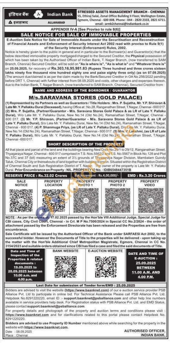 All that piece and parcel of the land and the buildings bearing New Door No. 29/1 to 29/12, Ranganathan Street, Thyagaraya Nagar, Chennai-600-017 comprised in T.S. Nos 5562/2 and T.S. No.5567 in Block No. 128 and Plot No.37C and 37 (bit) measuring an extent of 3% grounds of Thyagaraya Nagar Division, Mambalam Guindy Taluk. Chennai City or thereabouts of land together with building thereon. Situated within the Registration District of Chennai South and Sub Registration District of T. Nagar. The owner of the property is Late Mr. Y. Pallaku