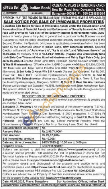 Schedule: The specific details of the assets in which security interest is created are enumerated here under Schedule 'A' Propanty: All that piece and parcel of the property bearing TS No 1365 Ward No 2 Door No Old 16 New No 25 Kumbeswarar North Street North Row Kumbakonam Town Thanjavur Dist Tamilnadu 612001 measuring 4107.50Sq Ft Consisting of residential & Commercial Building belonging to Smt RH Mani Bai Wio Haridoss and Bounded on: East By Sankar Pandiyan Property, West by: Govindaswamy Chettiyar Property, North by Sanitary Lane South by Street