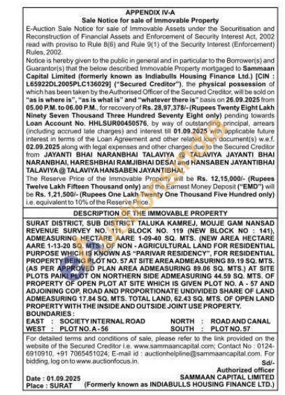 SURAT DISTRICT, SUB DISTRICT TALUKA KAMREJ, MOUJE GAM NANSAD REVENUE SURVEY NO. 111, BLOCK NO. 119 (NEW BLOCK NO 141), ADMEASURING HECTARE AARE 1-09-40 SQ. MTS. (NEW AREA HECTARE AARE 1-13-20 SQ. MTS.) OF NON-AGRICULTURAL LAND FOR RESIDENTIAL PURPOSE WHICH IS KNOWN AS "PARIVAR RESIDENCY", FOR RESIDENTIAL PROPERTY BEING PLOT NO. 57 AT SITE AREA ADMEASURING 89.19 SQ. MTS. (AS PER APPROVED PLAN AREA ADMEASURING 89.06 SQ. MTS) AT SITE PLOTS PAIKI PLOT ON NORTHERN SIDE ADMEASURING 44.59 SQ. MTS. OF PROPERTY OF OPEN PLOT AT SITE WHICH IS GIVEN PLOT NO. A-57 AND ADJOINING COP, ROAD AND PROPORTIONATE UNDIVIDED SHARE OF LAND ADMEASURING 17.84 SQ. MTS. TOTAL LAND, 62.43 SQ. MTS. OF OPEN LAND PROPERTY WITH THE INSIDE AND OUTSIDE JOINT USE PROPERTY.