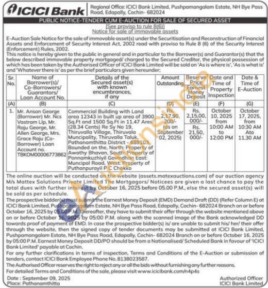 Commercial Building with Land area 12343 in built up area of 3900 Sq.Ft and 1500 Sq.Ft in 11.47 Ares (28.34 Cents) Re Sy No 19. Thiruvalla Village, Thiruvala Muncipality. Thiruvalla Taluk Pathanamthitta District-689103 Bounded on the, North: Property of Awathy Bhavan, South: Property of Ponnamkuzhiyil Govindhan East: Muncipal Road, West: Property of Puthanpurayil PC Chakko