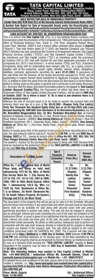 Office No. 1 on the second floor of Morbi Plaza lying and being on total land admeasuring 1317.82 Sq. Mtrs. of Morbi City Survey Ward No. 1, City Survey No. 121 to 129, 137, 141 to 143, 1891 to 1896, 1900, 1901 to 1904, Morbi Gujarat. Office No. 1 admeasuring 142.6 Sq. Mtrs i.e. 1535 Sq. Feet. Boundaries of Office No. 1 is as follows:, On North: Showroom No. 2; On South: Others Property: On Eastern: Passage and O.T.S: On West: Road