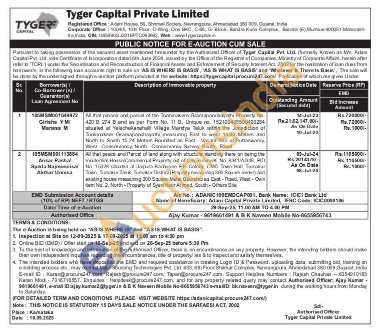 All that peace and Parcel of land along with structure standing there on being the residential House/Commercial Property out of City Survey/K. No. 834 1/A/348, PID No. 15328 situated at Jaipura Badavane P.H Colony, CMC Town Hall, Tumakur Town, Tumakur Taluk, Tumakur District (Property measuring 300 Square meter) and existing house measuring 300 Square Meter Bounded as East - Road, West - Own item No. 2, North-Property of Syed Noor Ahmed, South-Others Site