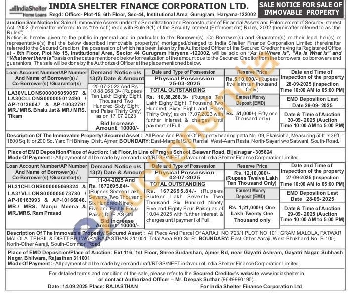 Description Of The Immovable Property/Secured Asset: All Piece And Parcel Of Property bearing patta No. 09, Ekalsinha, Measuring 50ft. x 36ft. = 1800 Sq.ft. or 200 Sq. Yard TH Bhinay, Distt. Ajmer. BOUNDARY: East-Mangilal S/O Ramlal, West-Aam Rasta, North-Sayari w/o Satwant, South-Road.