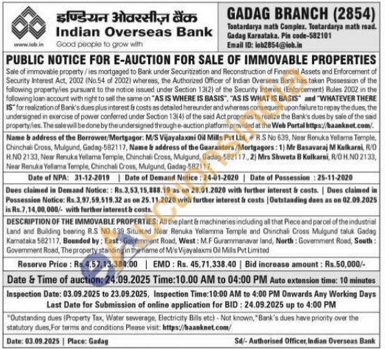 All the plant & machineries including all that Piece and parcel of the industrial Land and Building bearing R.S ND 639 Situated Near Renuka Yellamma Temple and Chinchali Cross Mulgund taluk Gadag Karnataka 582117, Bounded by: East: Government Road, West: M.F Gurammanavar land, Nerth: Govemment Road, South: Government Road, The property standing in the name of M/s Vijayalaxmi Oil Mills Pvt Limited