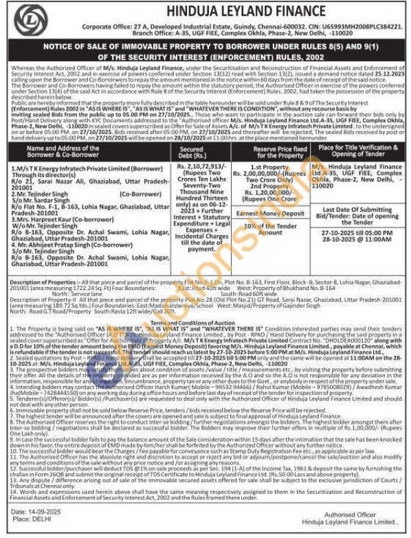 Description of Property- All that piece and parcel of the property Plat. No. 28 (Old Plot No.21) GT Road, Sarai Nazar, Ghaziabad, Uttar Pradesh-201001 (area measuring 189.72.5q. Yes.) Four Boundaries: East Madarsalsłamiya/School West: Masjid/Property of Gajinder Singh North: Road GT Road/Property South Rasta 12ft wide/Gali 20ft.