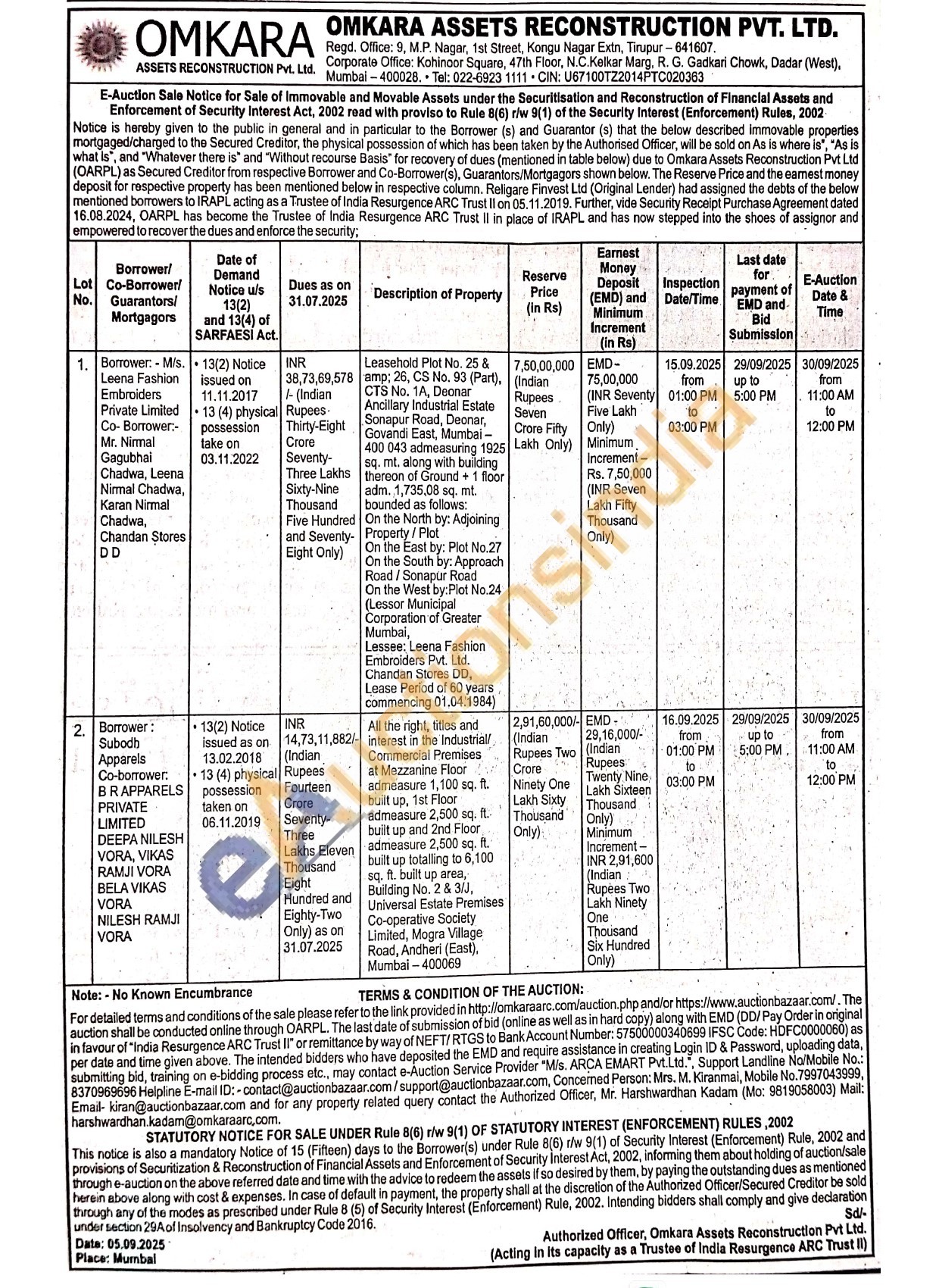 All the right, titles and interest in the Industrial Commercial Premises at Mezzanine Floor admeasure 1,100 sq. ft. built up, 1st Floor admeasure 2,500 sq. ft. built up and 2nd Floor, admeasure 2,500 sq. ft. built up totalling to 6,100 sq. ft. built up area, Building No. 2 & 3/J, Universal Estate Premises Co-operative Society Limited, Mogra Village Road, Andheri (East), Mumbai-400069