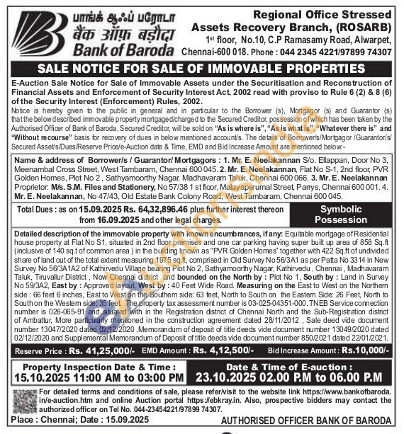 Equitable mortgage of Residential house property at Flat No S1, situated in 2nd floor premises and one car parking having super built up area of 858 Sq.ft (inclusive of 140 sq.t of common area) in the building known as "PVR Golden Homes" together with 422 Sq.ft of undivided share of land out of the total extent measuring 1975 sq.ft, comprised in Old Survey No 56/3A1 as per Patta No 33 14 in New Survey No 56/3A 1A2 of Kathirvedu Village bearing Plot No 2, Sathyamoorthy Nagar, Kathirvedu, Chennai, Madhavaram Taluk, Tiruvallur District, Now Chennai district and bounded on the North by: Plot No 1, South by: Land in Survey No 59/3A2, East by: Approved layout, West by: 40 Feet Wide Road. Measuring on the East to West on the Northem side: 66 feet 6 inches, East to West on the Southern side: 63 feet, North to South on the Eastern Side: 26 Feet, North to Southon the Western side: 35 feet The property tax assessment number is 03-025-04351-000. TNEB Service connection number is 026-065-91 and situated with in the Registration district of Chennai North and the Sub-Registration district of Ambattur, More particularly mentioned in the construction agreement dated 28/11/2012, Sale deed vide document number 13047/2020 dated 02/12/2020, Memorandum of deposit of title deeds vide document number 13049/2020 dated 02/12/2020 and Supplemental Memorandum of Deposit of title deeds vide document number 850/2021 dated 22/01/2021
