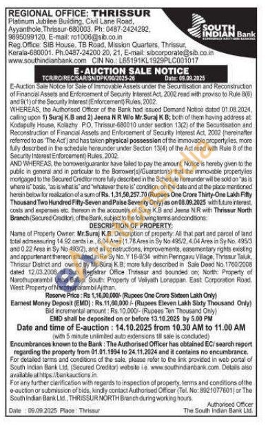 All that part and parcel of land total admeasuring 14.92 cents i.e., 6.04 Ares (1.78 Ares in Sy No 495/2, 4.04 Ares in Sy No. 495/3 and 0.22 Ares in Sy No 493/2), and all constructions, improvements, easementary rights existing and appurtenant thereon situated in Re Sy No. Y 18-9/34 within Peringavu Village, Thrissur Taluk Thrissur District and owned by Mr Suraj K.B, more fully described in Sale Deed No.1760/2008 dated 12.03.2008 of Sub Registrar Office Thrissur and bounded on, North: Property of Narothuparambil Usha Balan. South: Property of Veliyath Lonappan. East: Corporation Road. West: Property of Narothuparambil Ajthan