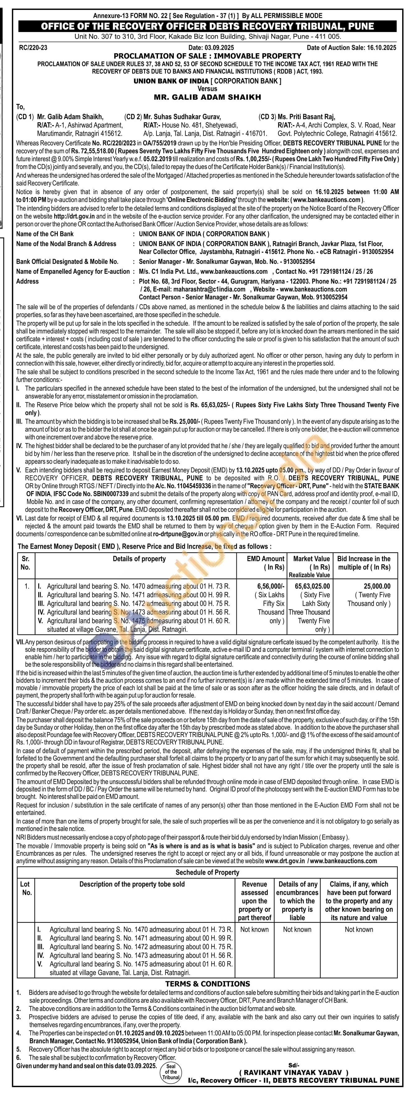 1. Agricultural land bearing S. No. 1470 admeasuring about 01 H. 73 R II. Agricultural land bearing S. No. 1471 admeasuring about 00 H. 99 R. III. Agricultural land bearing S. No. 1472 admeasuring about 00 H. 75 R IV. Agricultural land bearing S. No. 1473 admeasuring about 01 H. 56 R. V. Agricultural land bearing S. No. 1475 admeasuring about 01 H. 60 R situated at village Gavane, Tal. Lanja, Dist. Ratnagiri.
