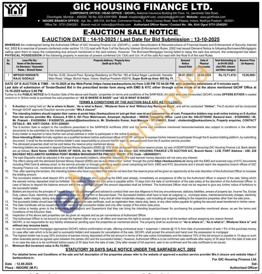 Contact Authorized Officer Name / Contact No: Ms. Kirti Ogra/ 0731-2540281