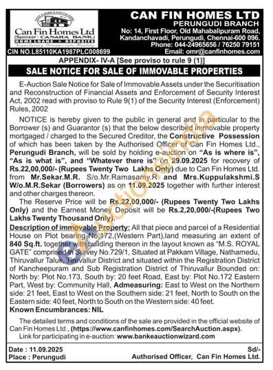 All that piece and parcel of a Residential House on Plot bearing No.172, (Western Part), land measuring an extent of 840 Sq.ft. together with building thereon in the layout known as "M.S. ROYAL GATE comprised in Survey No.729/1, Situated at Pakkam Village, Nathamedu, Thiruvallur Taluk, Tiruvallur District and situated within the Registration District of Kancheepuram and Sub Registration District of Thiruvallur Bounded on: North by: Plot No. 173, South by: 20 feet Road, East by: Plot No.172 Eastern Part, West by: Community Hall, Admeasuring: East to West on the Northern side: 21 feet, East to West on the Southern side: 21 feet, North to South on the Eastern side: 40 feet, North to South on the Western side: 40 feet