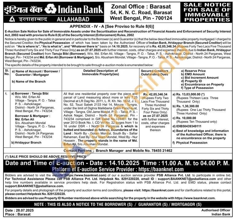 All that one residential property over the piece and parcel of Land measuring about more or less 7.25 Decimal at LR Dag No. 2011, L. R. Kh. No. 1632, J. L. No. 52, Touzi Sabek 2133 Hal 14, Mouza Tangra, under the limit of Dighra Malikberia Gram Panchayat, Village - Tangra, Old Jame Masjid, P. O. - Talsa, P. S. -Ashok Nagar, District North 24 Parganas, Pin -743234 comprised in Gift Deed No.1-04461 for the year 2013 Book No. I, CD Vol No. 22 pages from 1 to 16 under DSRI North 24 Parganas & which is butted and bounded as follows, Boundaries of the Land: North By Golam Mondal, South By Safiar Rahaman, East By- Nur Islam Mondal, West By - Nur Hossein. The property stands in the name of Md. Erfan Ali, S/o. Abusham Mondal.