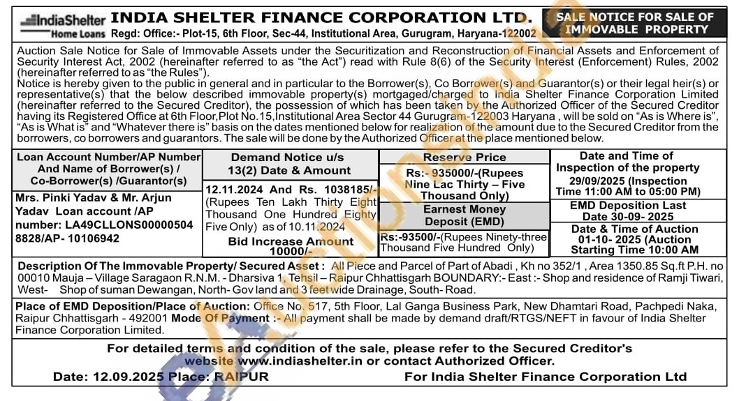 All Piece and Parcel of Part of Abadi, Kh no 352/1, Area 1350.85 Sq.ft P.H. no 00010 Mauja - Village Saragaon R.N.M. - Dharsiva 1, Tehsil - Raipur Chhattisgarh BOUNDARY:- East :- Shop and residence of Ramji Tiwari, West- Shop of suman Dewangan, North-Gov land and 3 feet wide Drainage, South-Road.