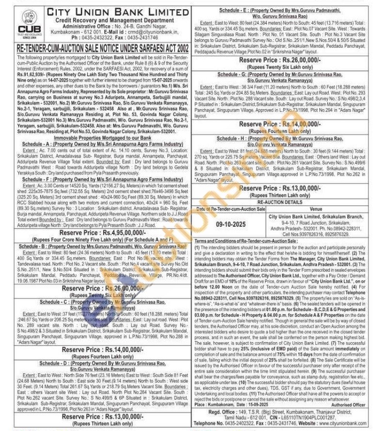 Schedule-A: (Property Owned by Ms. Sri Annapurna Agro Farms Industry) Extent Ac. 7.00 cents out of total extent of Ac. 14.10 cents, Survey No.3, Location: Srikakulam District, Amadalavasa Sub- Registrar, Burja mandal, Annampela, Panchayat. Adduripela Revence Village Total extent. Bounded by. East Dry land belongs to Guruvu Padmavathi West Road towards Adduripeta village North Dry land belongs to Gedela Yerakkya South: Dry land purchased from Pyla Prasanth previously Schedule-F: (Property Owned by Mis. Sri Annapurna Agro Farms Industry) Extent: Ac. 3.00 Cents or 14520 Sq. Yards (12156.27 Sq. Meters) in which 1st cement sheet shed 225x35-7875 Sq feet (732.55 Sq. Meters) 2nd cement sheet shed: 76x46-3496 Sq feet (325.20 Sq. Meters) 3rd cement sheet shed: 40x24-960 Sq. Feet (89.30 Sq. Meters) In which RCC Slabbed house along with two motors and current connection, 40x24 = 960 Sq. Feet (89.30 Sq.meters) Survey No 3 Location: Srikakulam district. Amadalavasa Sub-Registrar. Burja mandal, Annampeta, Panchayat, Adduripeta Revenue Village. Northern side to J.J Road Total extent Bounded by: East: Dry land belongs to Guruvu Padmavathi West Road towards Adduripeta village North: Dry land belongs to Pyla Prasanth South JJ Road