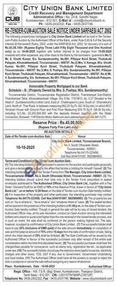 Tiruvannamalai District, Tiruvannamalai Registration District, Thandrampet Sub-District, Thandrampet Taluk, Kivanakkambadi Village, Dry S.No. 119/1813, Ac. 0.27 Situated to the West of: Sundaramoorthy's other Land, East of Chakkrapani's Land, South of: Dhanakkot's Land, North of Thar Road, in between measuring 992.25 Sq Ft. (92:18 Sg/mts.) in which RCC Terraced House with Ground Floor and First Floor Measuring 624.75 Sq.ft. (58.04 Sq.mts.) including S.C.No. 02.243.004.393 with the deposits thereon together with the Water Connection, Borewell, 1 HP Electric Motor, Bathroom and Laterine bearing D. No.891/1270