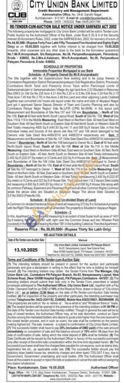 The Site together with the Superstructure Now existing and to be putup thereon in Coimbatore Registration District Periyanaickenpalayam Sub Registration District, Previously Coimbatore North Taluk and Presently Annur Taluk within Panchayat Limits of Sarkansamakam in Sarkarsamakulam Village dry agn land Acre 2.52 Situated in Resurvey Nos 55612 (in Old Os No.235 Acre 4.21 Kist Rs 2.20 in GS.No. 236 Acre 3.24 Kat Rs 2.10 Total Acre 7.45 Kist Rs.3.75) in this Acre 2.48 this Land and other adjoining Lands Clubbed together was converted into house site layout under the name and style of Mayapuri Nagar and got & approved Senior Deputy Director of Town and Country Planning and also by Coimbatore Periyar Nilgin Region Vide No.LPIR (CPN) No:89/86. In the layout joint Measurement and Boundaries of Site Nos: 107 and 100 are. Boundaries: North of Site No:109, East of 40 feet wide North-South Layout Road, South of Site No:106, West of Site Nos 118 & 119 in the Middle Measuring: East Weston Northern Side -60 feet East West on Southem Side-60 feet North South on Eastern Side 80 feet North South on Western Side B0 feet Totally measuring 4800 Sqft (445.93 Sqmtr) 11 and 006 Sqft Vacant Site in this the individual metes and bounds of the above site Nos. 107 and 108 which belonged to the Owners vide Sale Deed Nos 4489/2014 and 4488/2014 respectively are Item 1 Measurement and Boundaries of Site No. 107 (Vide Sale Deed Doc 4489(2014) belonged to Owner-1 Boundaries: North of Site No. 108 belonged to Owner No 2, East of 40 feet wide North-South layout Road, South of Site No. 106 West of Site No. 119 in the Middle Measuring: East West on Northern Side-60 feet. East west on Southerm Side -60 feet, North South on Eastern Side-40 feet, North South on Western Site 40 leet Totally Admeasuring 2.400 Sq.ft (222.97 Sq meter) or 5 Cents and 222 Sq.ft of House site. Rem: 2 Measurement and Boundaries of Site No: 105 (Vide Sale Deed Doc. 4488/2014) belonged to Owner-2 Boundaries: North of Site No: 109, East of 40 feet wide North-South Layout Road, South of Site No. 107 belonged to Owner-1, West of Site No. 118 in the middle Measuring: East West on Northern Side-60 feet. East west on Southem Side-60ft North South on Eastem Side-40 feet North South on Westem Side 40 leet Totally admeasuring 2.400 Sqft (222.97 So meter) or 5 Cents and 222 Sq ft of House Site Thus (Above tem 1&2 Vacant Sites totally Ad measuring 4,800 Sq ft (44593 Sq.mtrs) or 11 Cents and 008 Sqft House Site along with Its common Pathway, Easement and Pavement Right and all other Common Rights Common areas the above shes are Stuated in Vayapuri Nagar The above Sites Situated in 5.F.No 556/2 (Patta No:59 Schedule-B (Common Un-divided Share of Land) A Common Un-divided fractional Share of land ad measuring 270 Sq it in Schedule Aproperty with the Right Title and interest with all amenities The property is Situaled in Valyapun Nagar Schedule-C In this, Apartment in Third floor Ad measuring to an extent of total Super built up area of 1401 Sqft bearing flat Number TB1 with right over the Common Areas and two Wheeler Park (covered) in the basement bearing Number TB1 in the building Called as Thendral Apartment