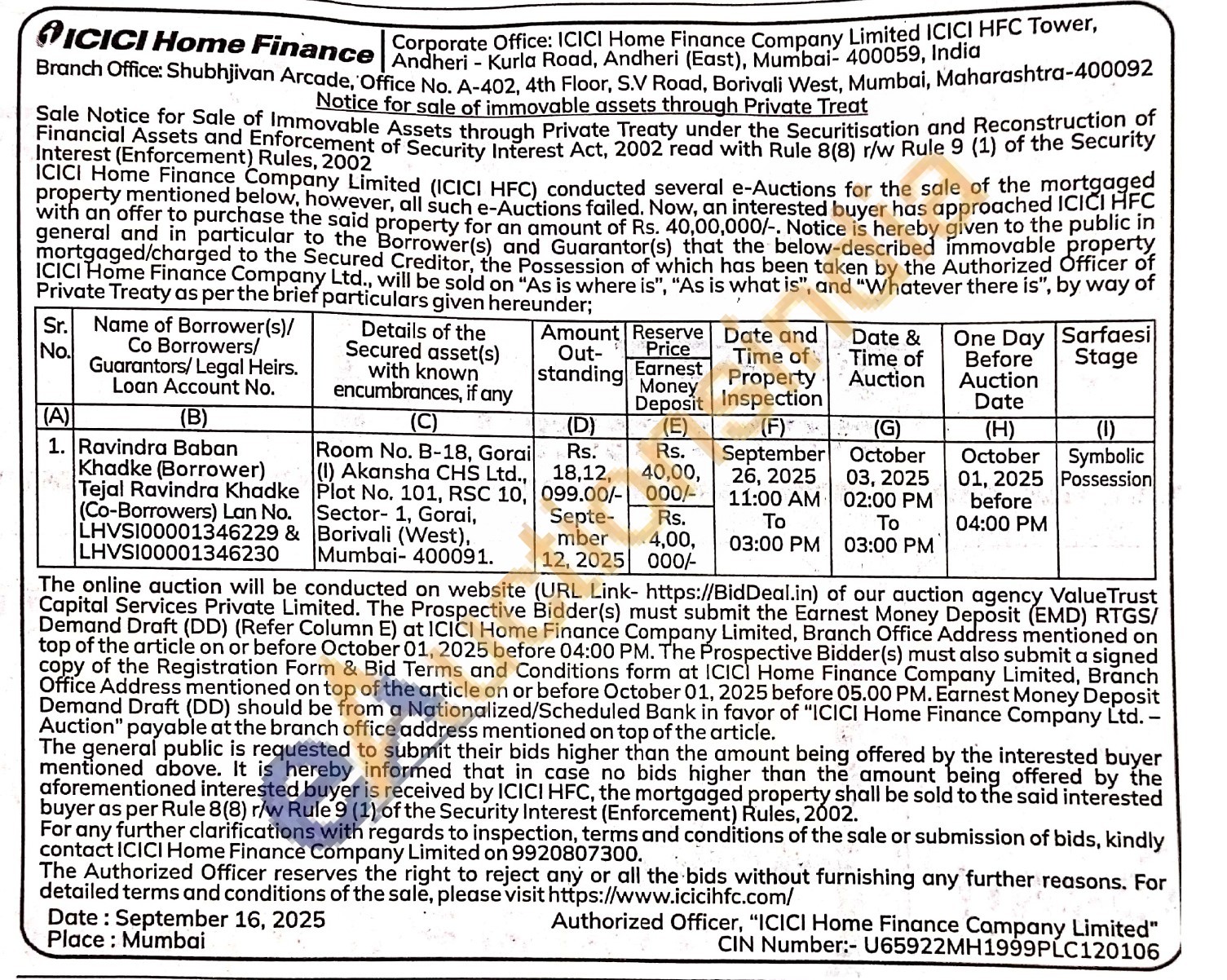 contact ICICI Home Finance Company Limited on 9920807300.