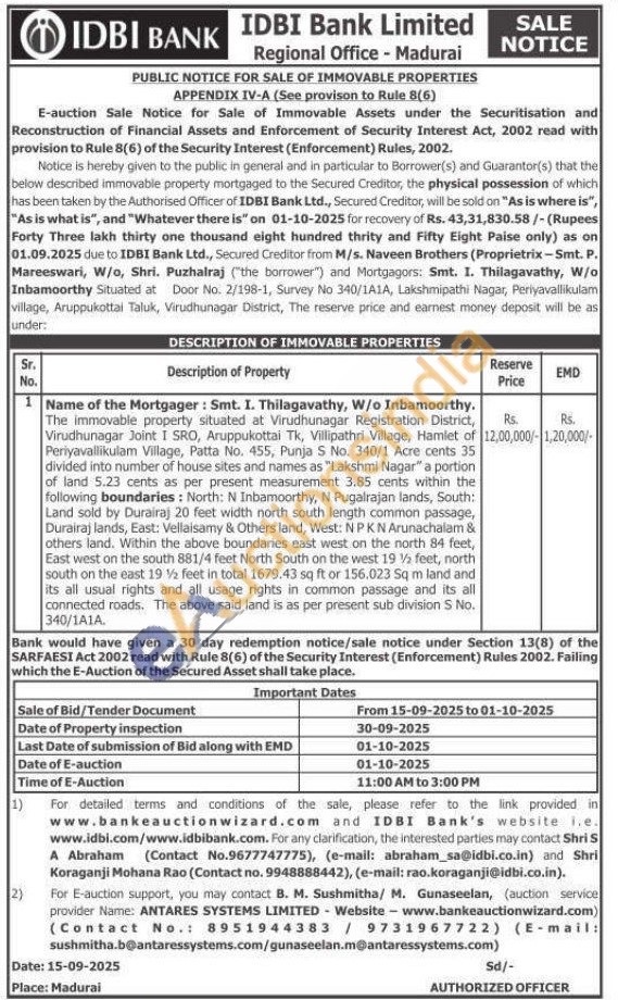 The immovable property situated at Virudhunagar Registration District, Virudhunagar Joint I SRO, Aruppukottai Tk, Villipathri Village, Hamlet of Periyavallikulam Village, Patta No. 455, Punja S No. 340/1 Acre cents 35 divided into number of house sites and names as "Lakshmi Nagar" a portion of land 5.23 cents as per present measurement 3.85 cents within the following boundaries: North: N Inbamoorthy, N Pugalrajan lands, South: Land sold by Durairaj 20 feet width north south length common passage, Durairaj lands, East: Vellaisamy & Others land, West: NPKN Arunachalam & others land. Within the above boundaries east west on the north 84 feet, East west on the south 881/4 feet North South on the west 19% feet, north south on the east 19 V2 feet in total 1679.43 sq ft or 156.023 Sq m land and its all usual rights and all usage rights in common passage and its all connected roads. The above said land is as per present sub division S No. 340/1A1A