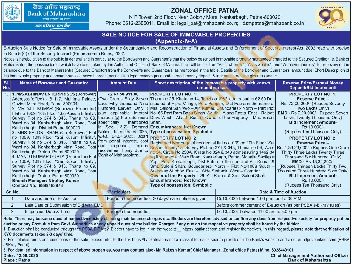 PROPERTY LOT NO. 1: Thana no 25, Khata no 14, Tauzi no 1982 admeasuring 62.50 Dec situated at Pipra Village, Post Punpun, Dist Patna in the name of Mrs. Saloni Sah W/o - Ajit Kumar. Boundaries:- North - Part Plot No-66 Part Ram Babu Singh. South-Alang Rasta. East - Rajpati Devi. West - Aland (Rasta). Owner of the Property - Mrs. Saloni Shah